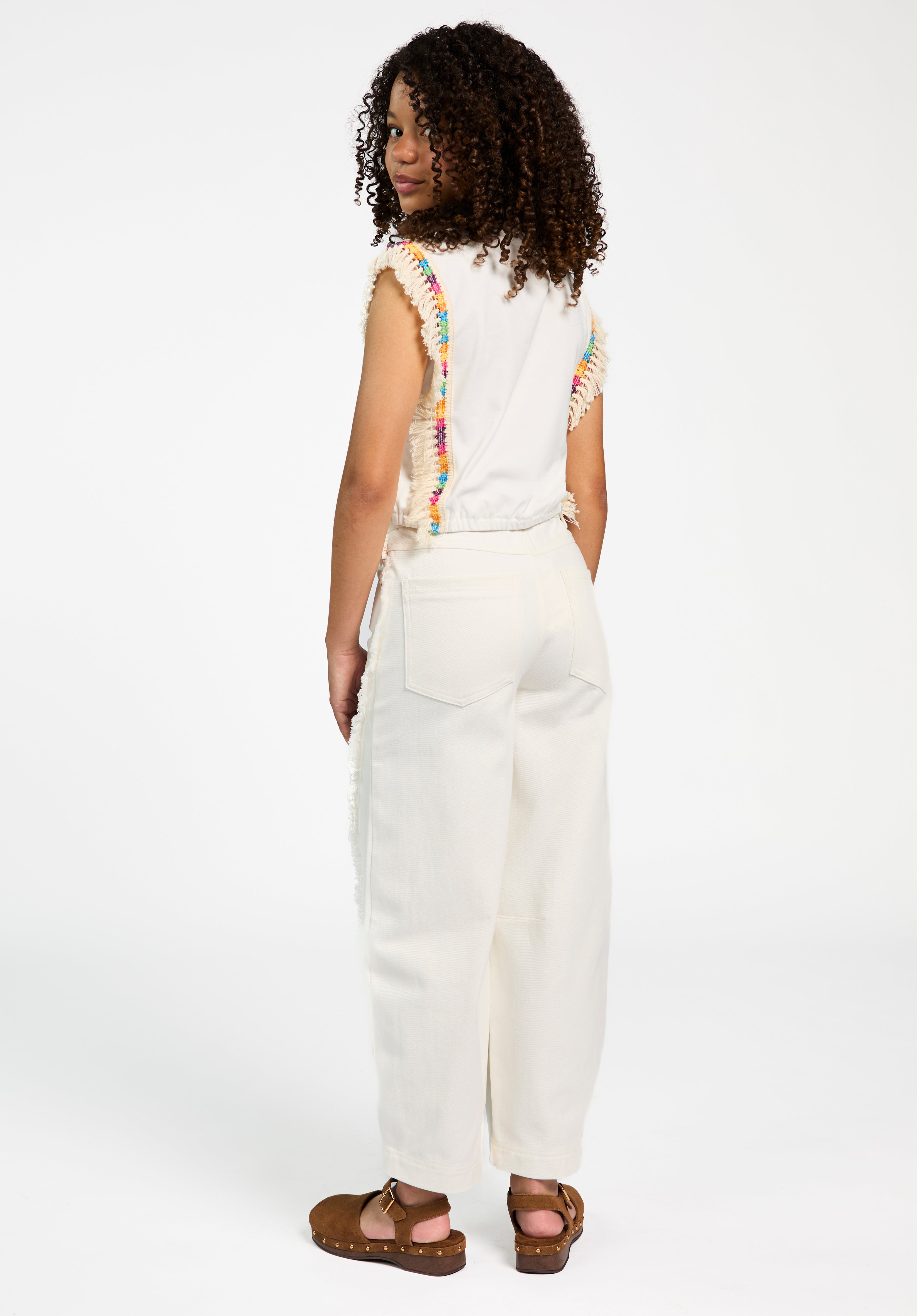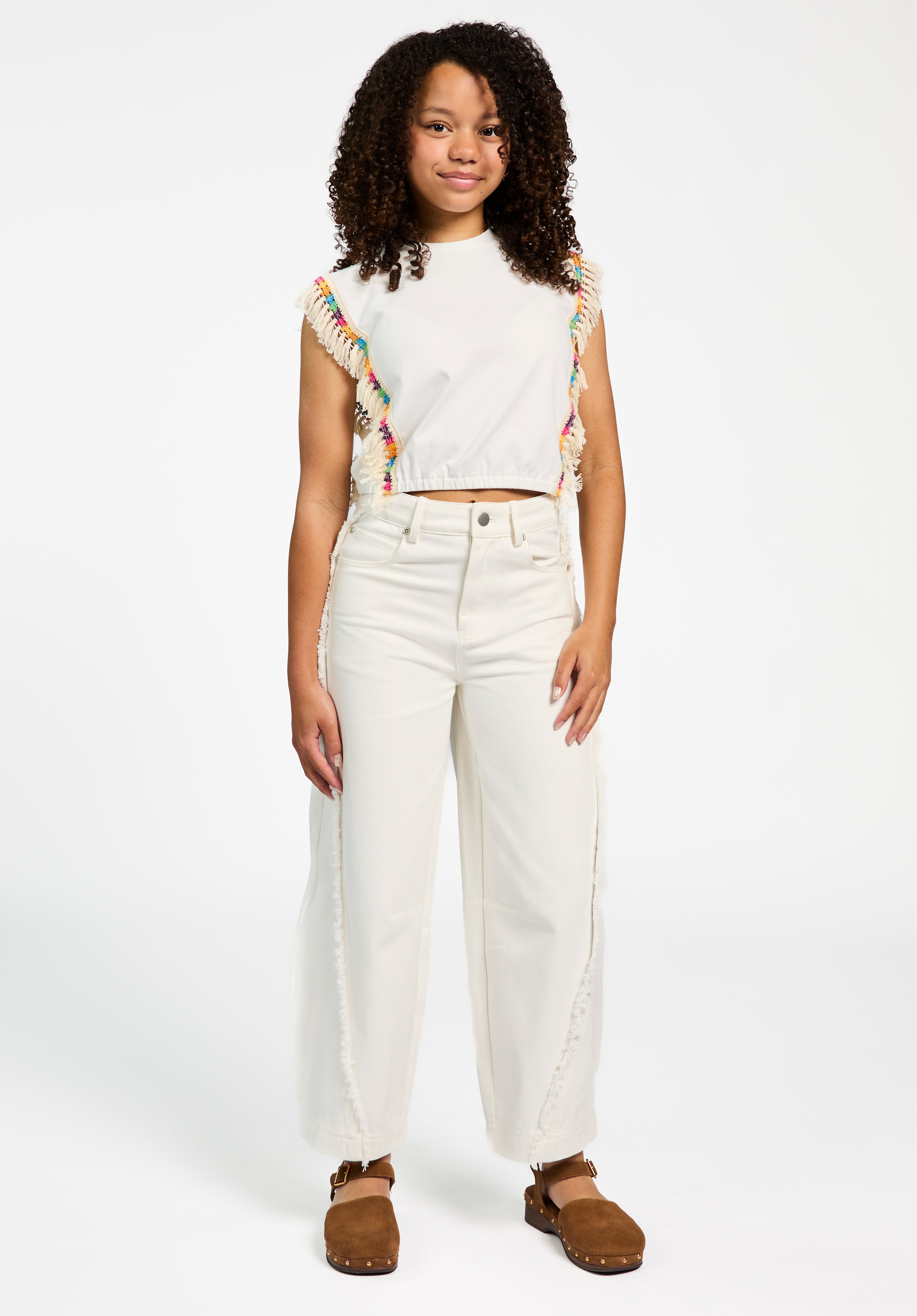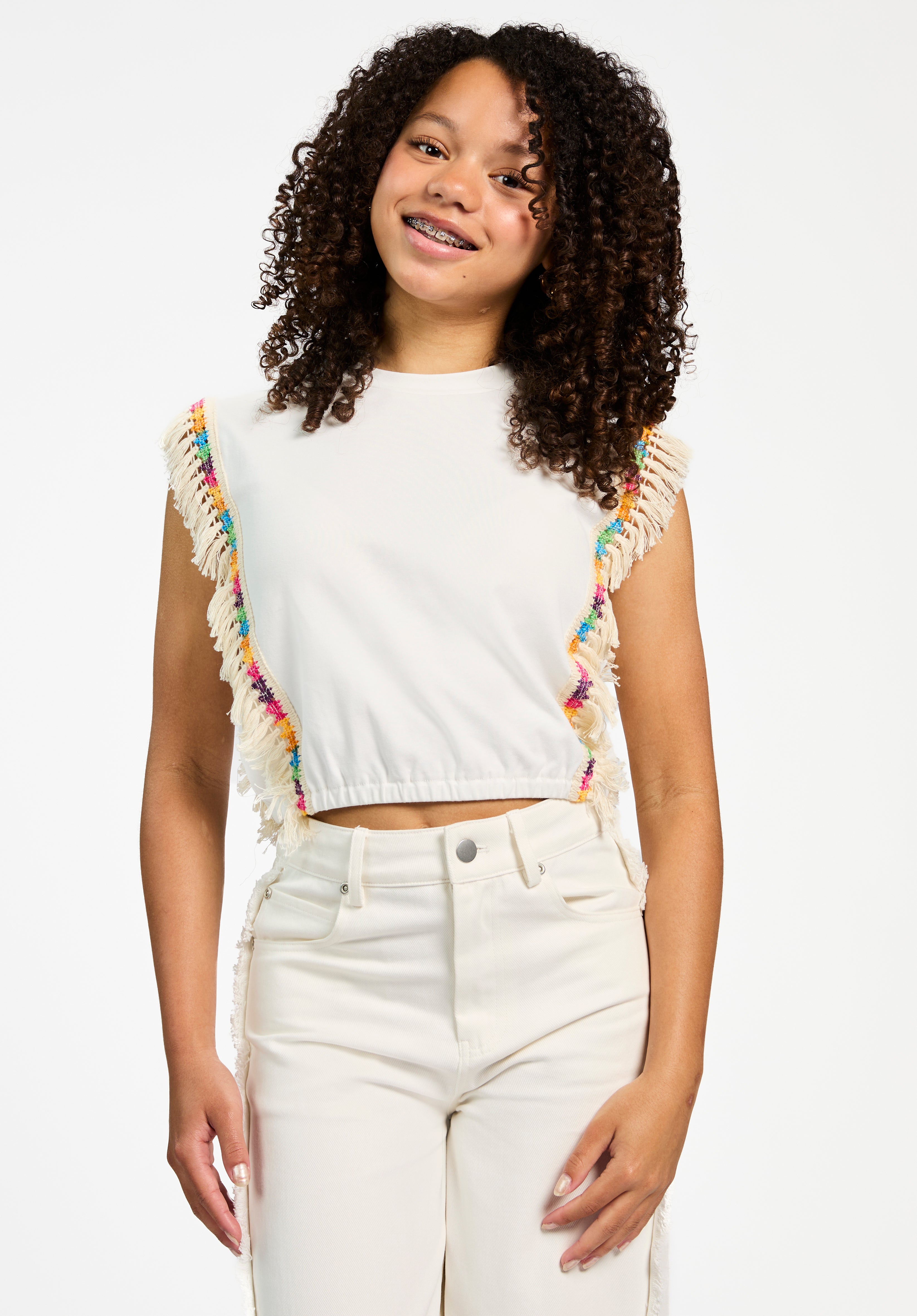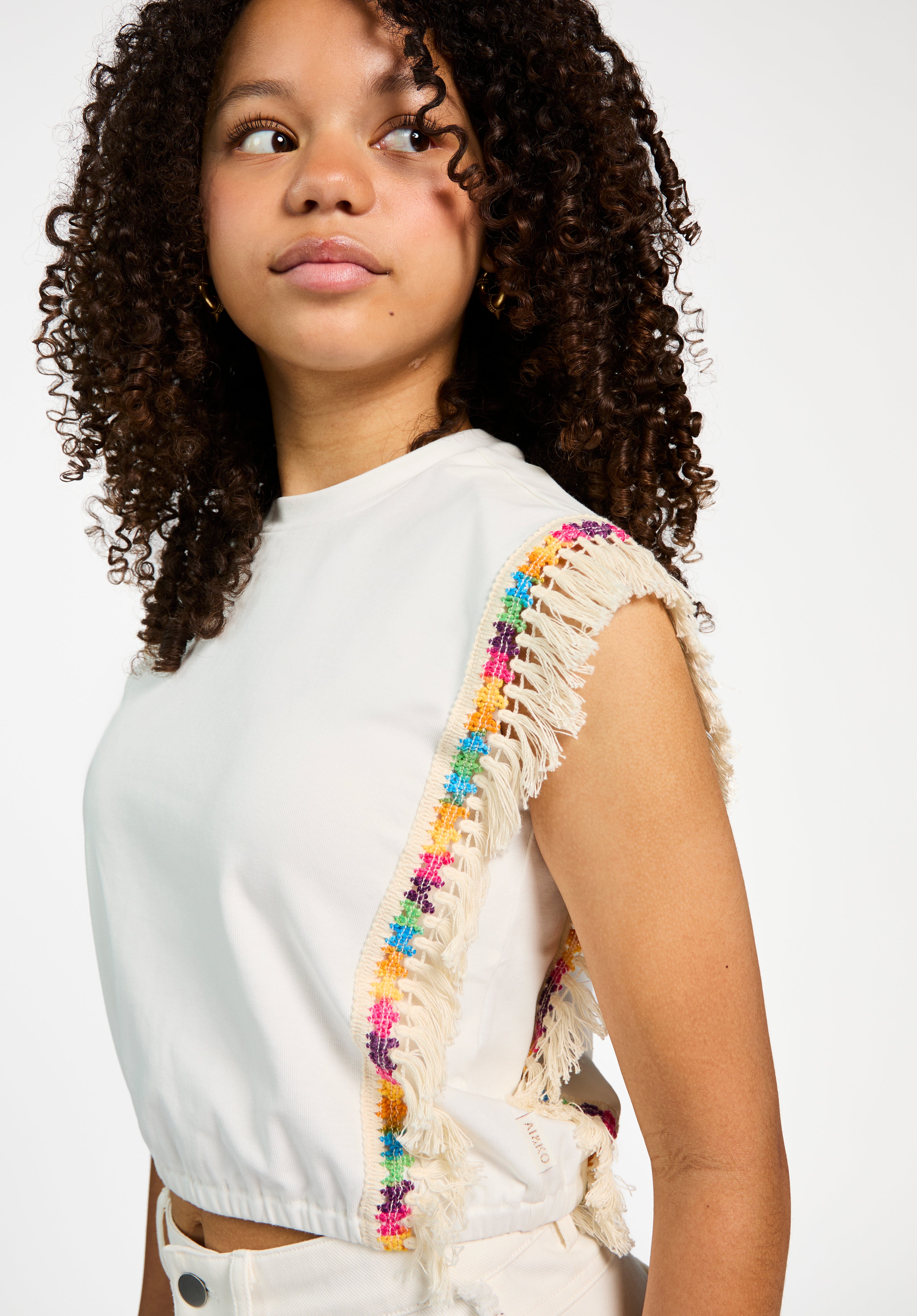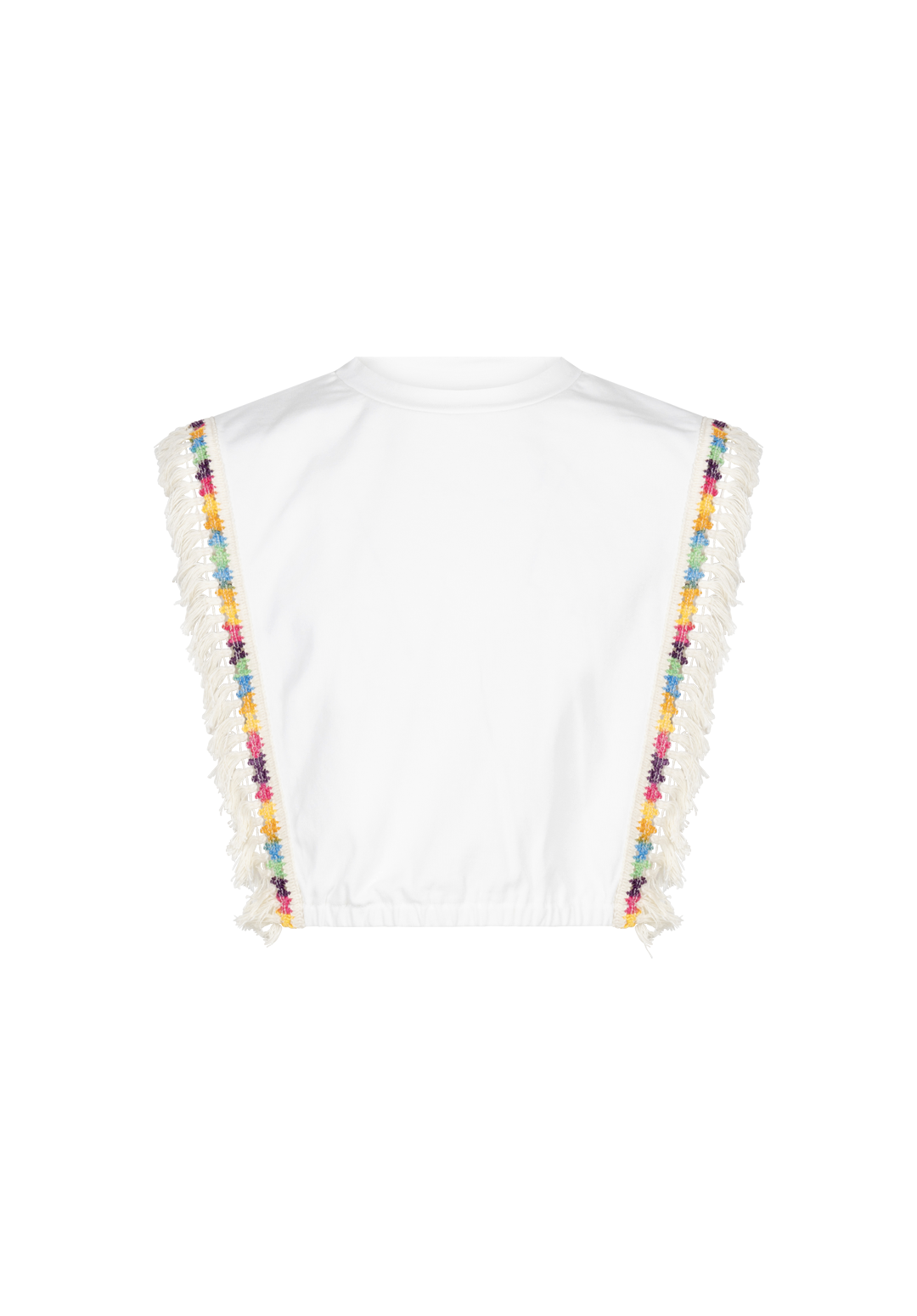 This white top gets a playful twist with striking details along the sides. The colorful embroidered trim combined with subtle fringe creates a fresh, summery look. Thanks to the elasticated underband, the style fits beautifully with a slightly cropped effect.