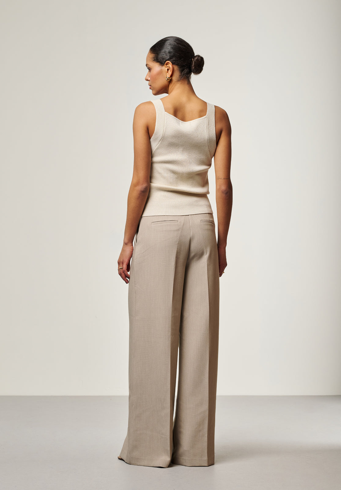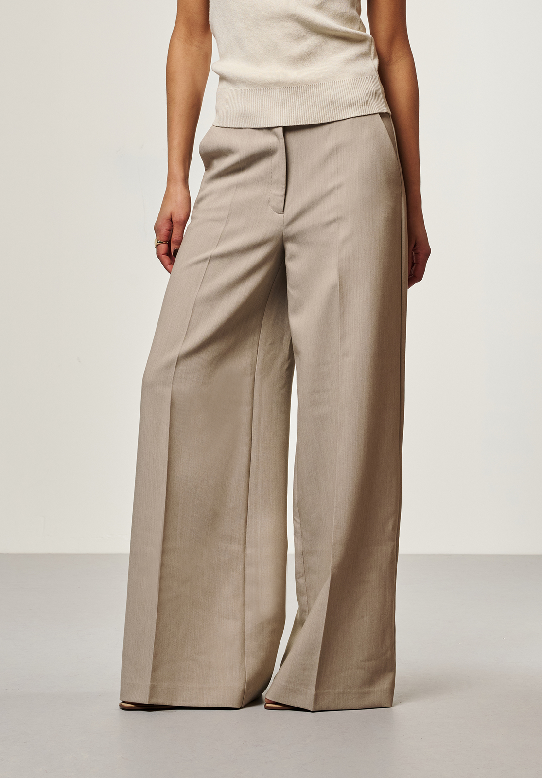 These trousers have a modern, feminine look and are designed with both fit and style in mind. The mid-rise waist ensures a comfortable fit, while the wide legs add depth to the silhouette. A versatile piece that works effortlessly with both formal and more casual outfits.
