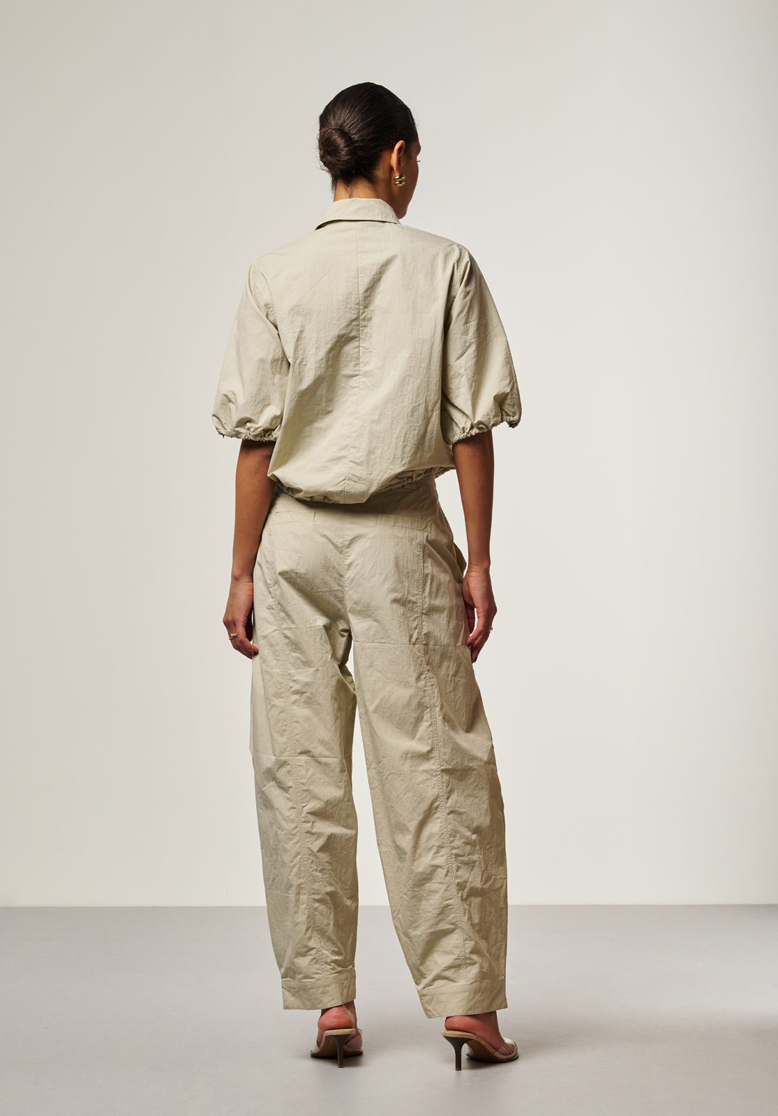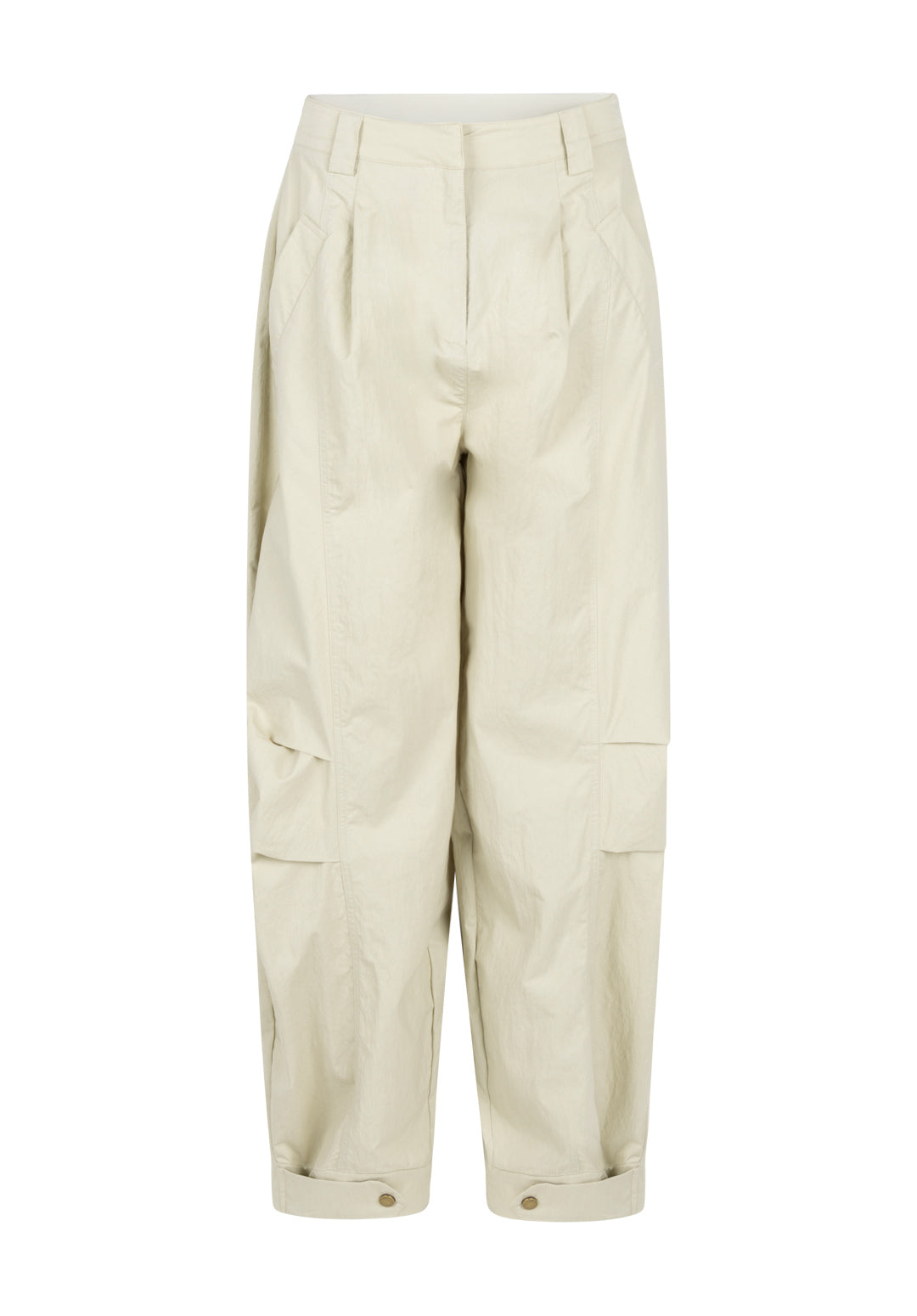 These soft sand-colored trousers have a comfortable, relaxed fit and a modern look. They feature pleats at the front and subtle pocket details on the legs for a bold accent. The straight legs have a relaxed fit, and the adjustable buttons at the hem add a playful touch.