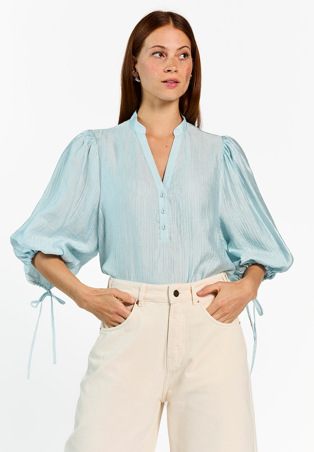De Dahlia Top is een luchtige blouse met een zachte glans en opvallende mouwen. Het lichte materiaal en de geplooide details zorgen voor een vrouwelijke, ontspannen uitstraling. De striksluiting aan de mouwen geeft dit item een speels accent. Combineer met de Sacha Barrel Jeans voor een frisse, moderne look.