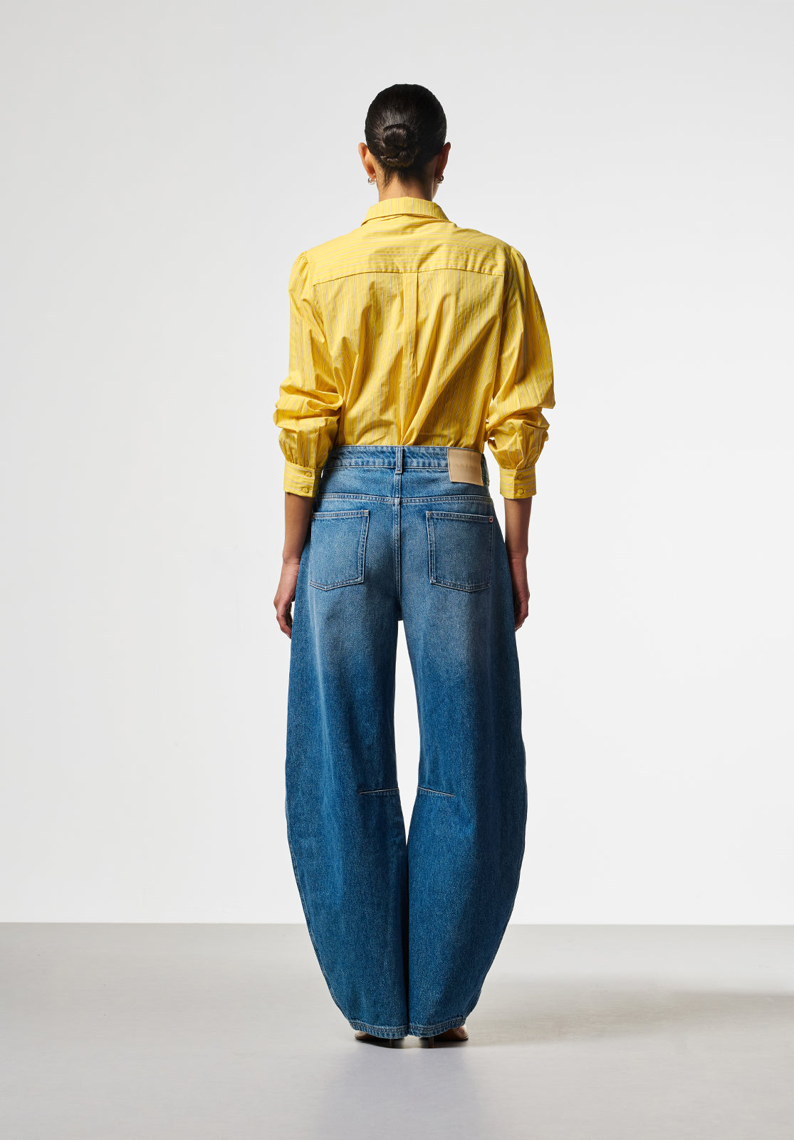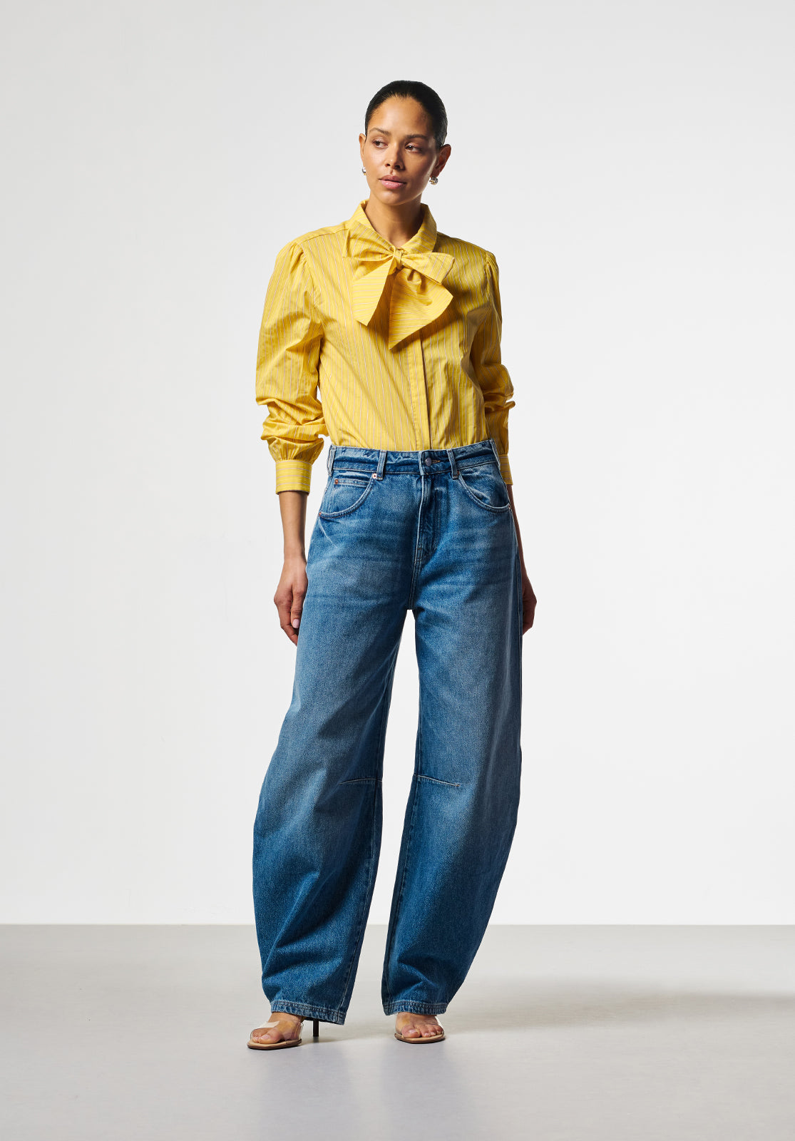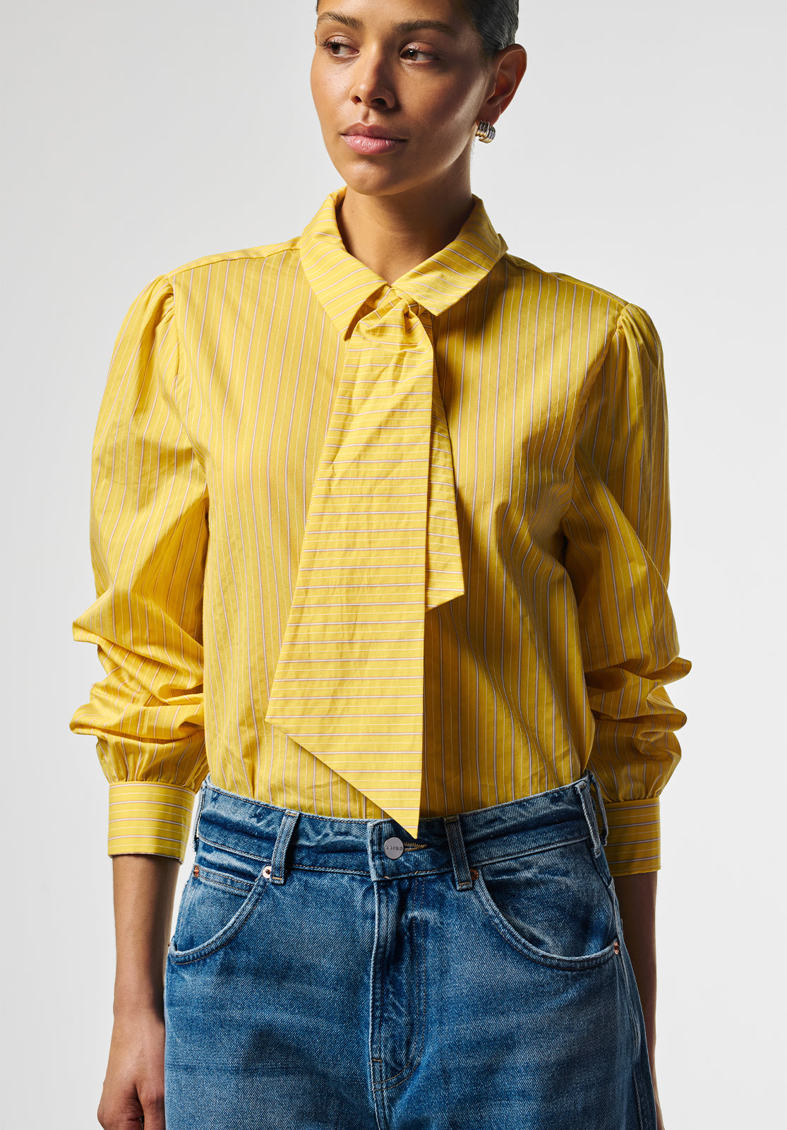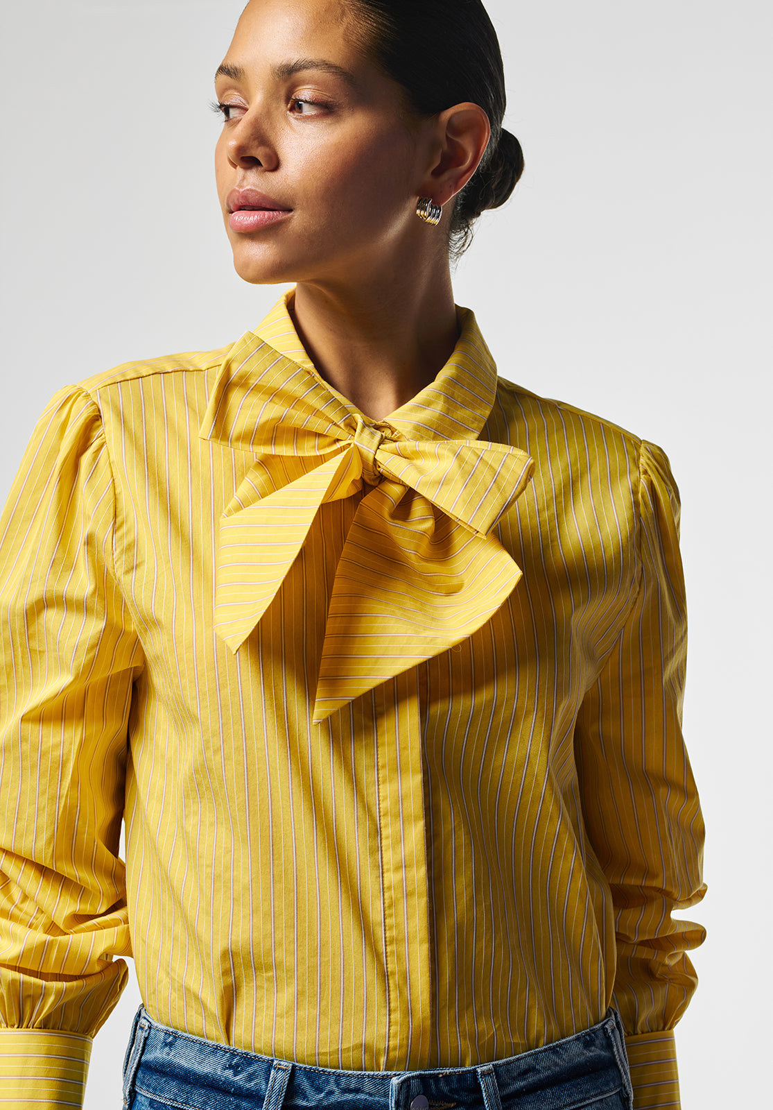 The Fenne Blouse is a feminine classic with a playful twist. Featuring a wide bow at the neck and a subtle stripe pattern, this blouse adds character without being over the top. The softly gathered shoulders and straight fit create a clean silhouette that still feels relaxed. Made from a lightweight cotton blend, it’s easy to style. Wear it loose or tucked into tailored trousers or a skirt.