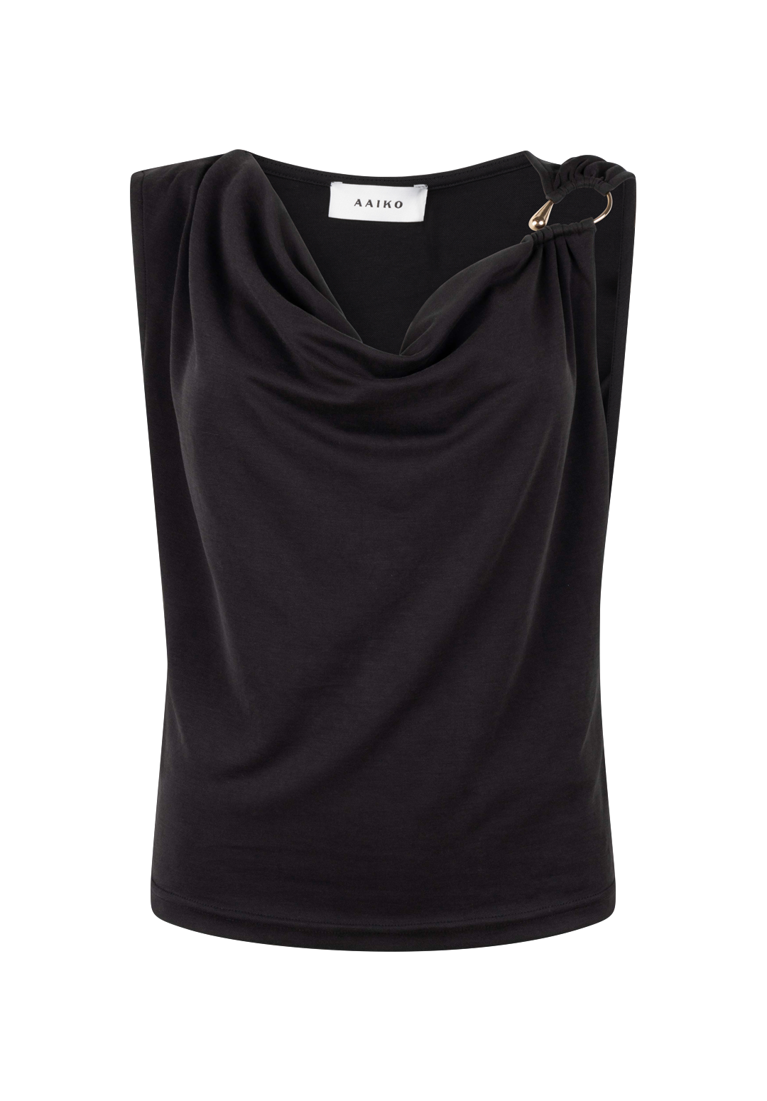 This top has an elegant and modern look. The gracefully draped neckline creates a sophisticated draped effect, while the subtle ring detail on the shoulder adds a stylish and unique touch.