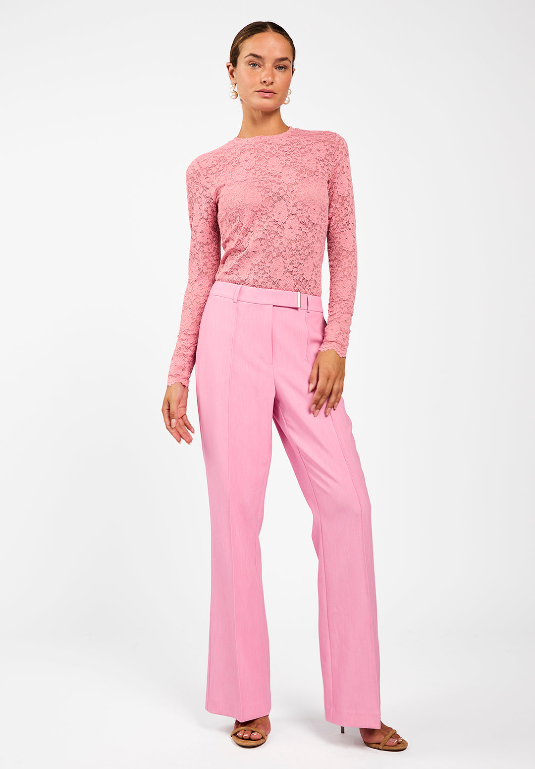 The Mason Top is a fitted piece made from soft, semi-sheer lace with a delicate floral pattern. It features a subtle stand-up collar and long sleeves, adding a modern touch to its romantic texture. Perfect for layering over a bralette or under a blazer to play with contrast and depth. Style it with the Chantalle trousers for a refined look.