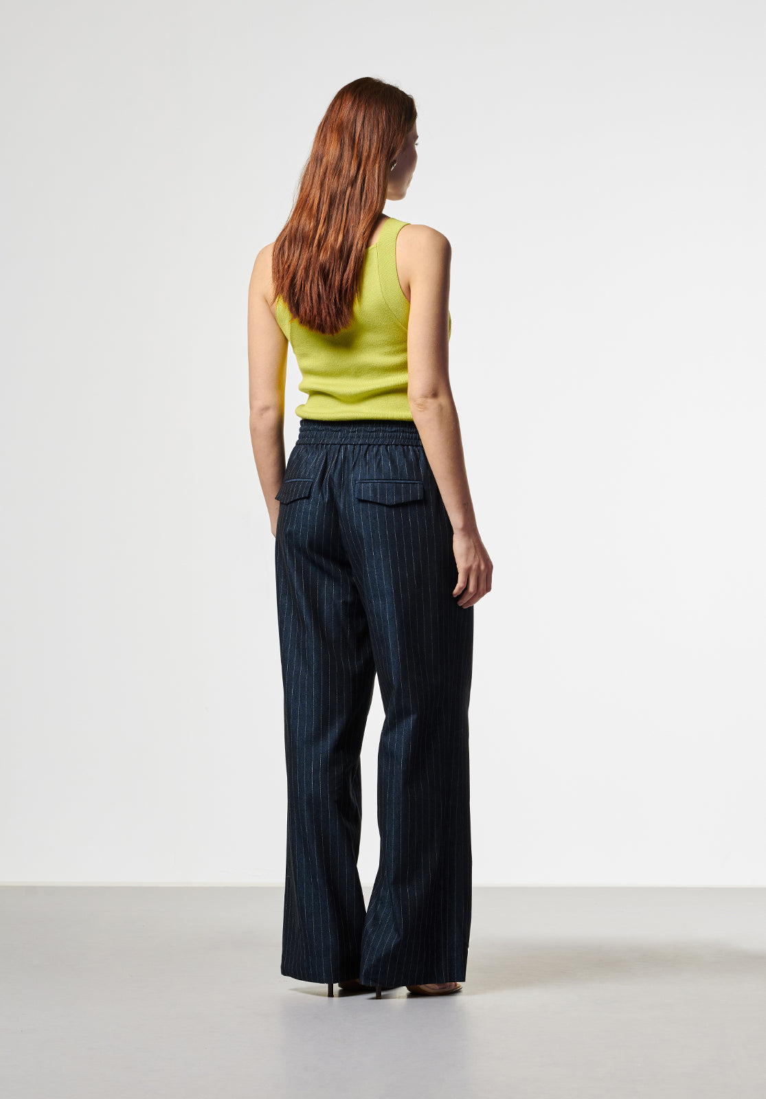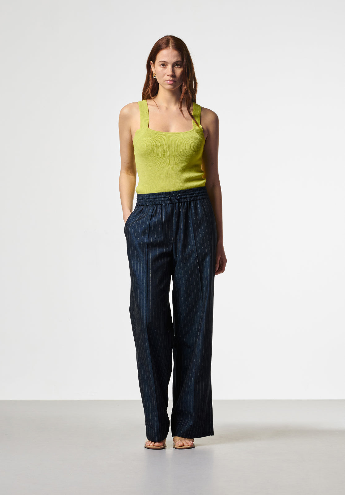 The Zena top is a sleeveless knit with a straight neckline and wide straps, designed for a close fit that subtly highlights your silhouette. The sturdy ribbed structure ensures it keeps its shape, making it a reliable choice for both layering and wearing on its own. Pair with the Esila trousers for a modern, comfortable outfit.