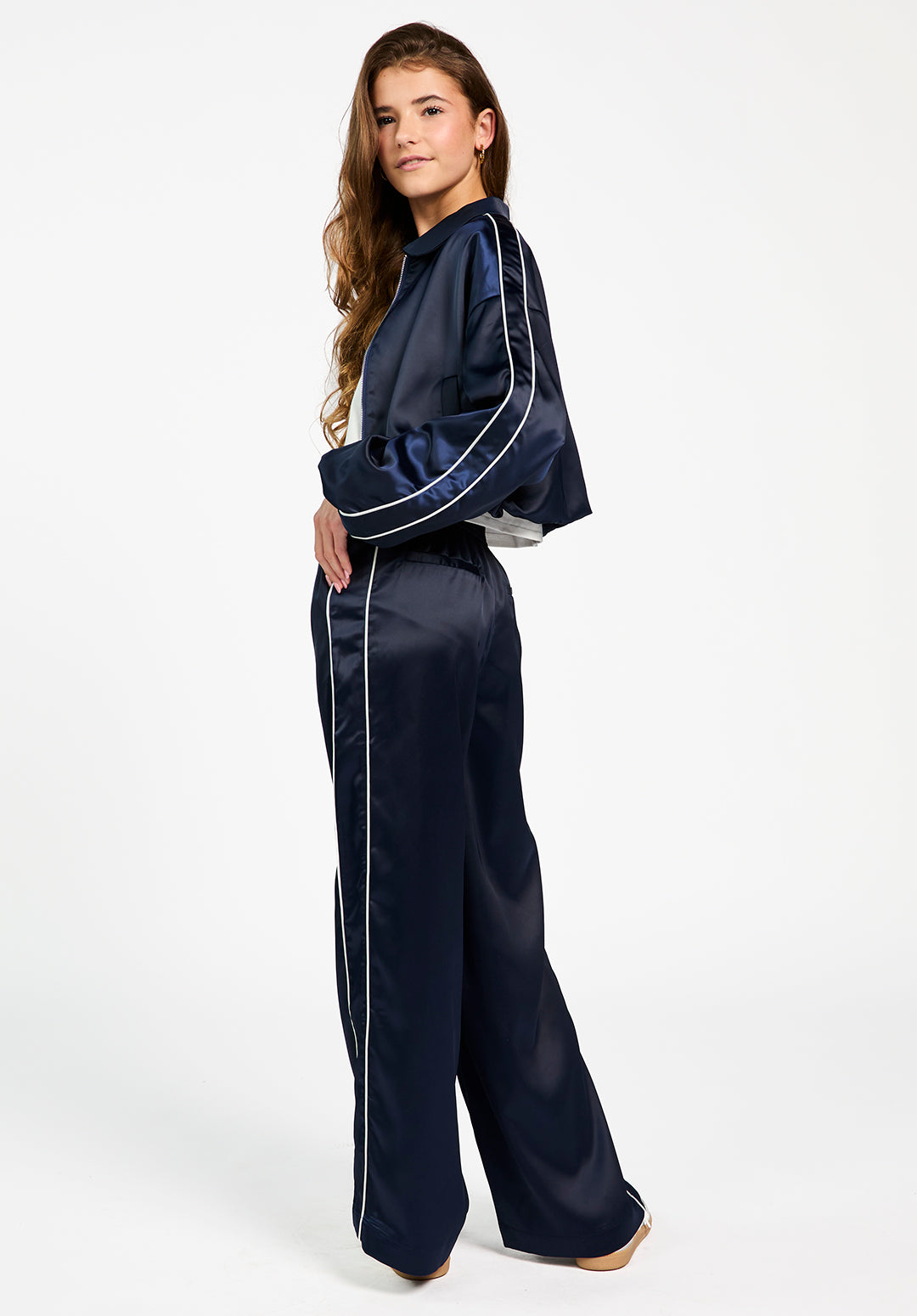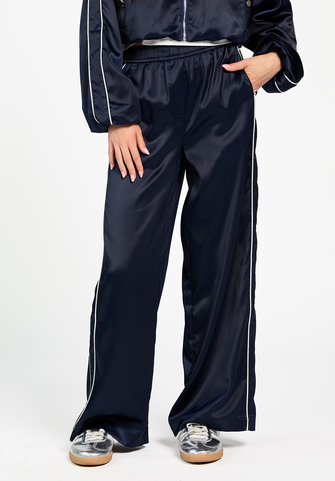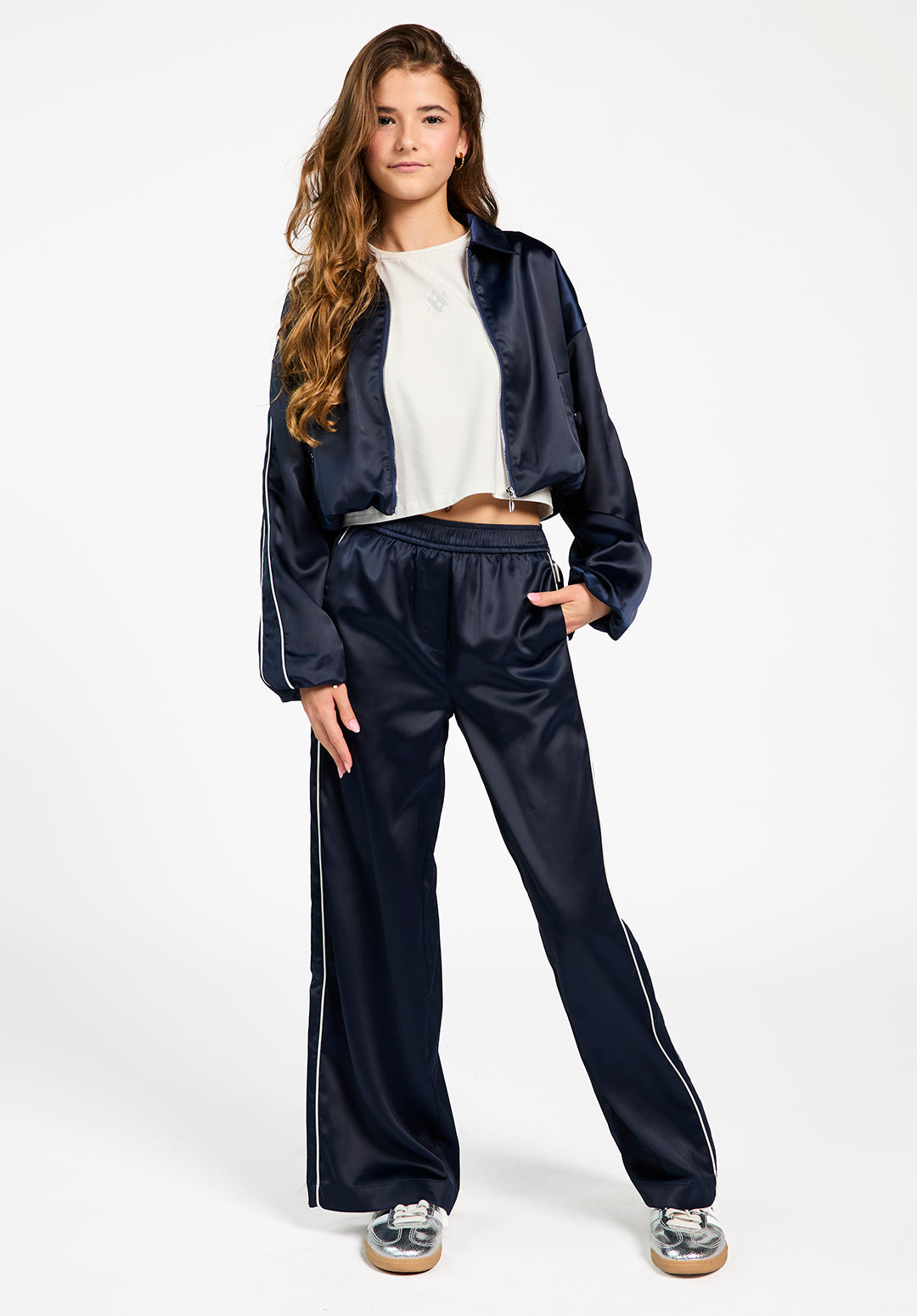 De Aurora Broek is gemaakt voor girls die houden van comfort én stijl. Deze navy broek met subtiele glans heeft een relaxte fit en witte biezen langs de zijkant voor een sporty look. De elastische tailleband zorgt voor een fijne pasvorm, ideaal om in te bewegen of gewoon lekker in te chillen. Combineer met het bijpassende Ilka jasje voor een coole co-ord set.