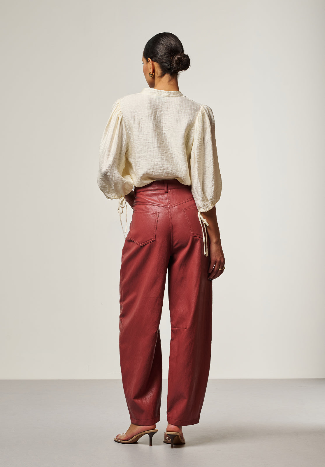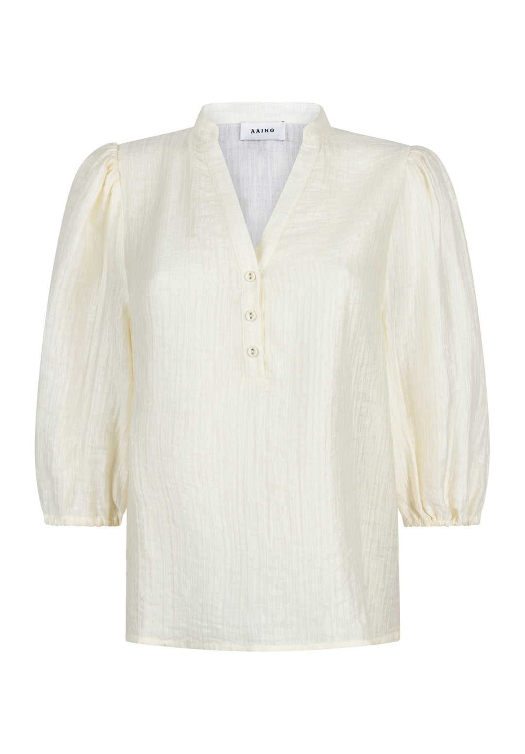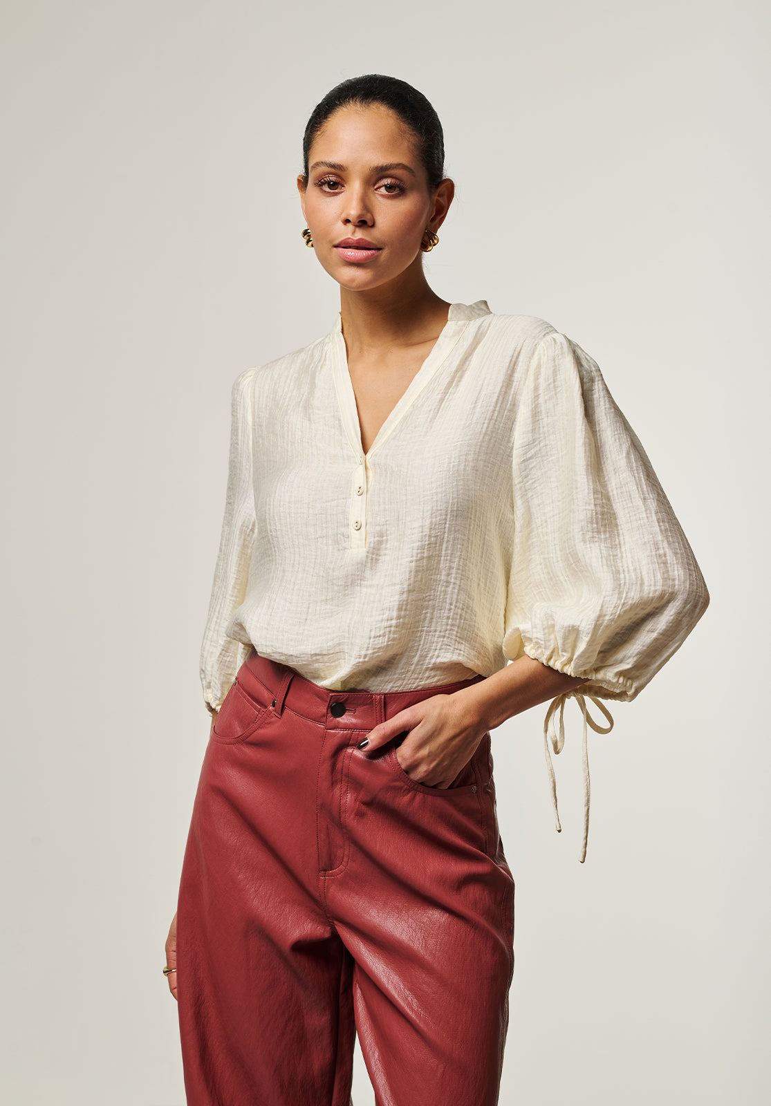 De Dahlia blouse is een luchtig model met een subtiele structuur in de stof en een rechte pasvorm. De blouse heeft een V-hals met knoopsluiting en licht gepofte mouwen die eindigen in een elastische boord. Een makkelijk te combineren item dat comfortabel zit en net dat beetje extra geeft aan je outfit. Mooi te combineren met de Charly jeans.