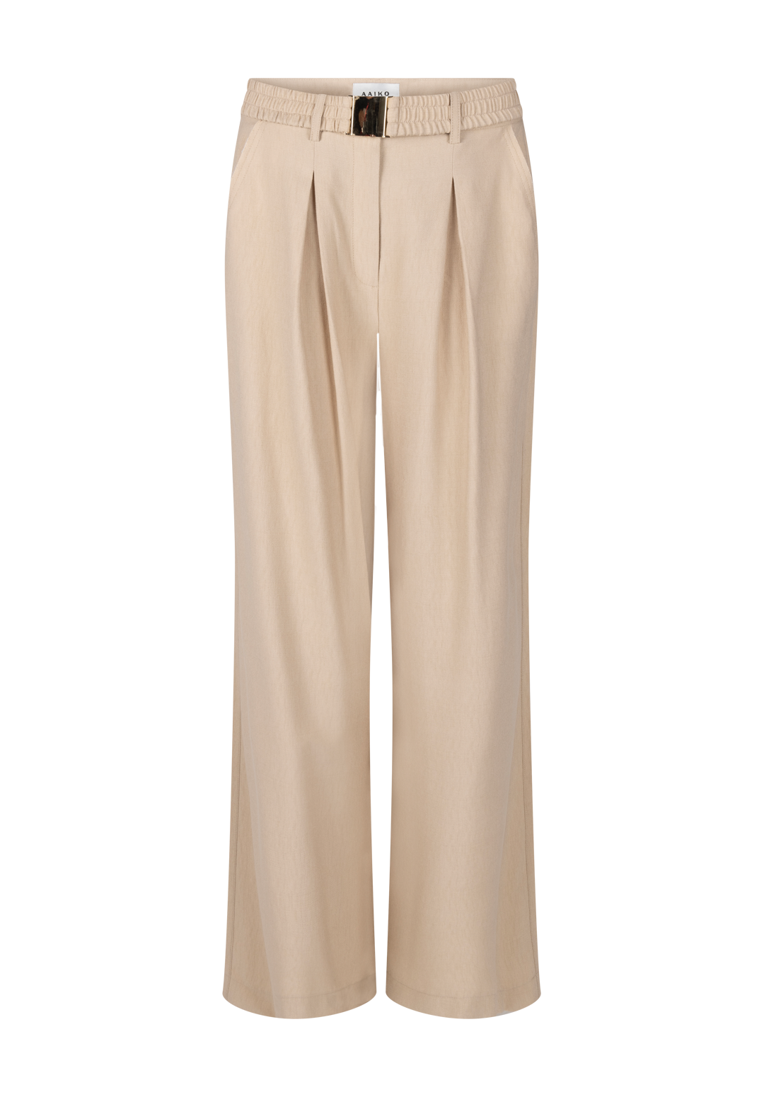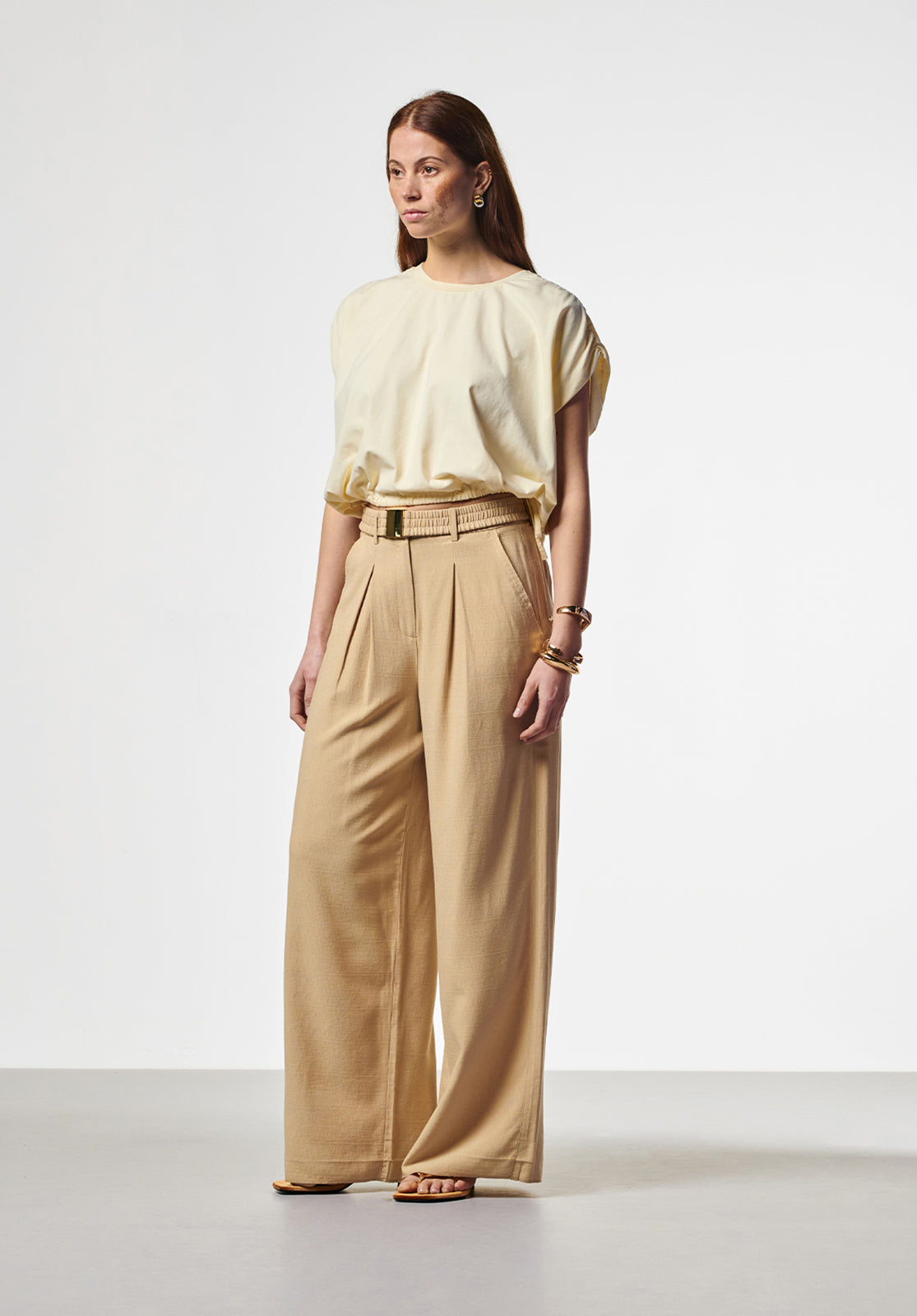 Deze broek heeft een elegante en luchtige uitstraling. Het model is hoog in de taille en valt los langs het been, wat zorgt voor een flatterend en comfortabel silhouet. De plooien aan de voorzijde geven extra verfijning, terwijl de elastische tailleband met gespdetail zorgt voor een moderne touch.
