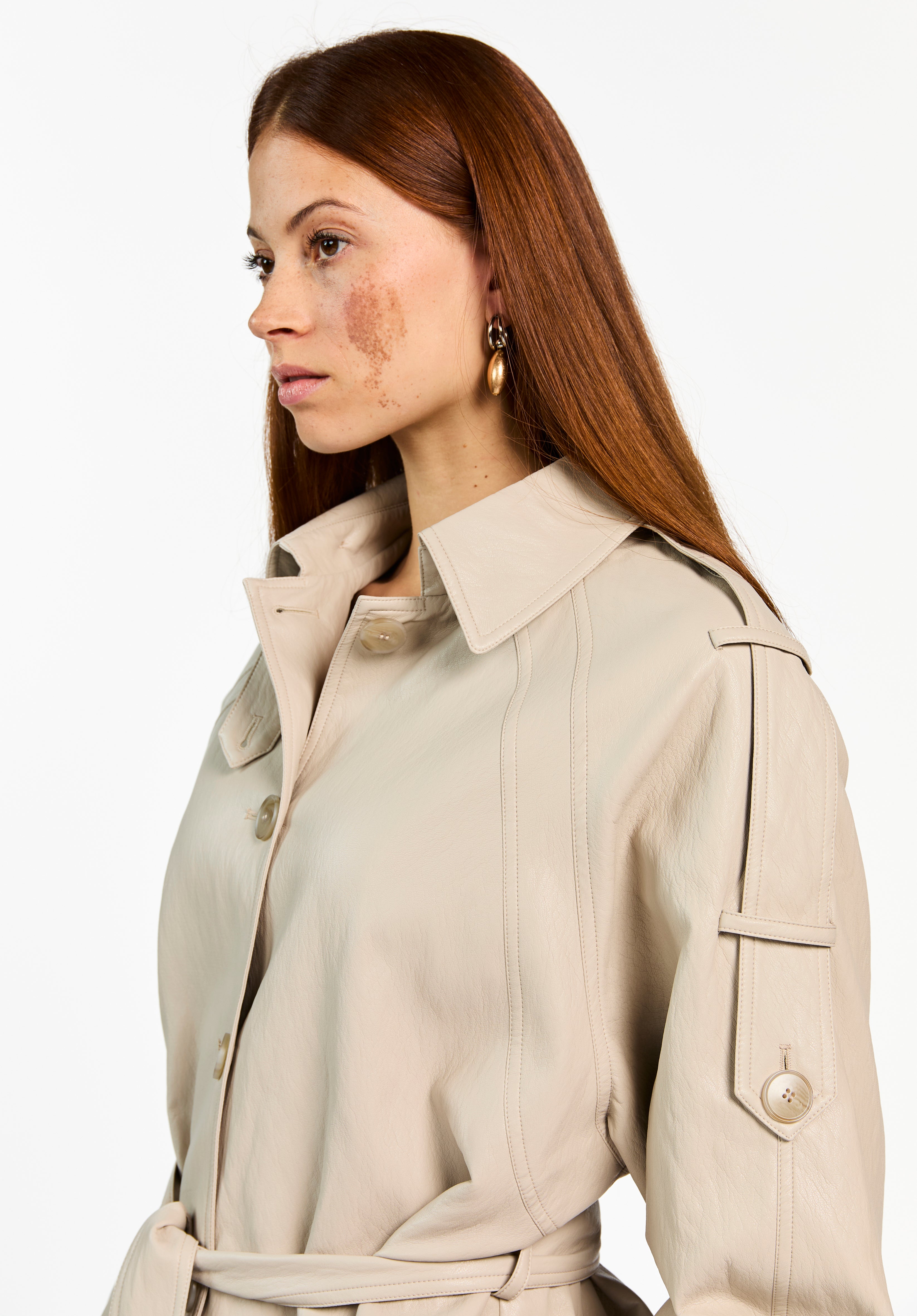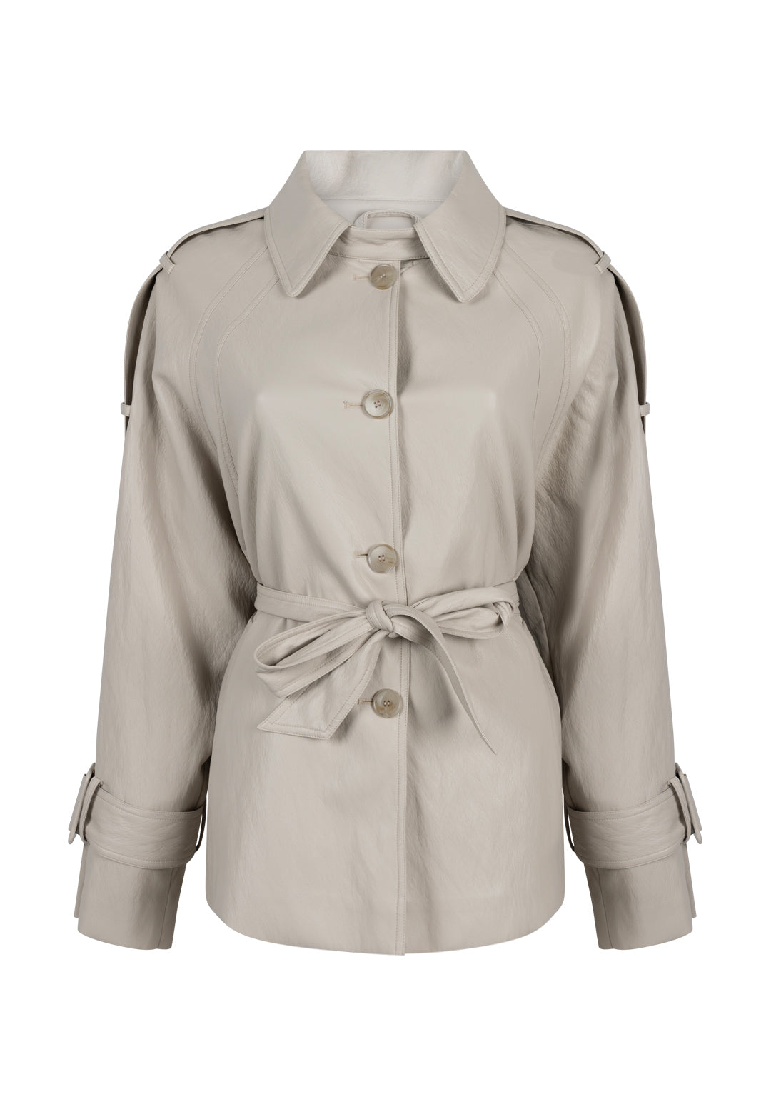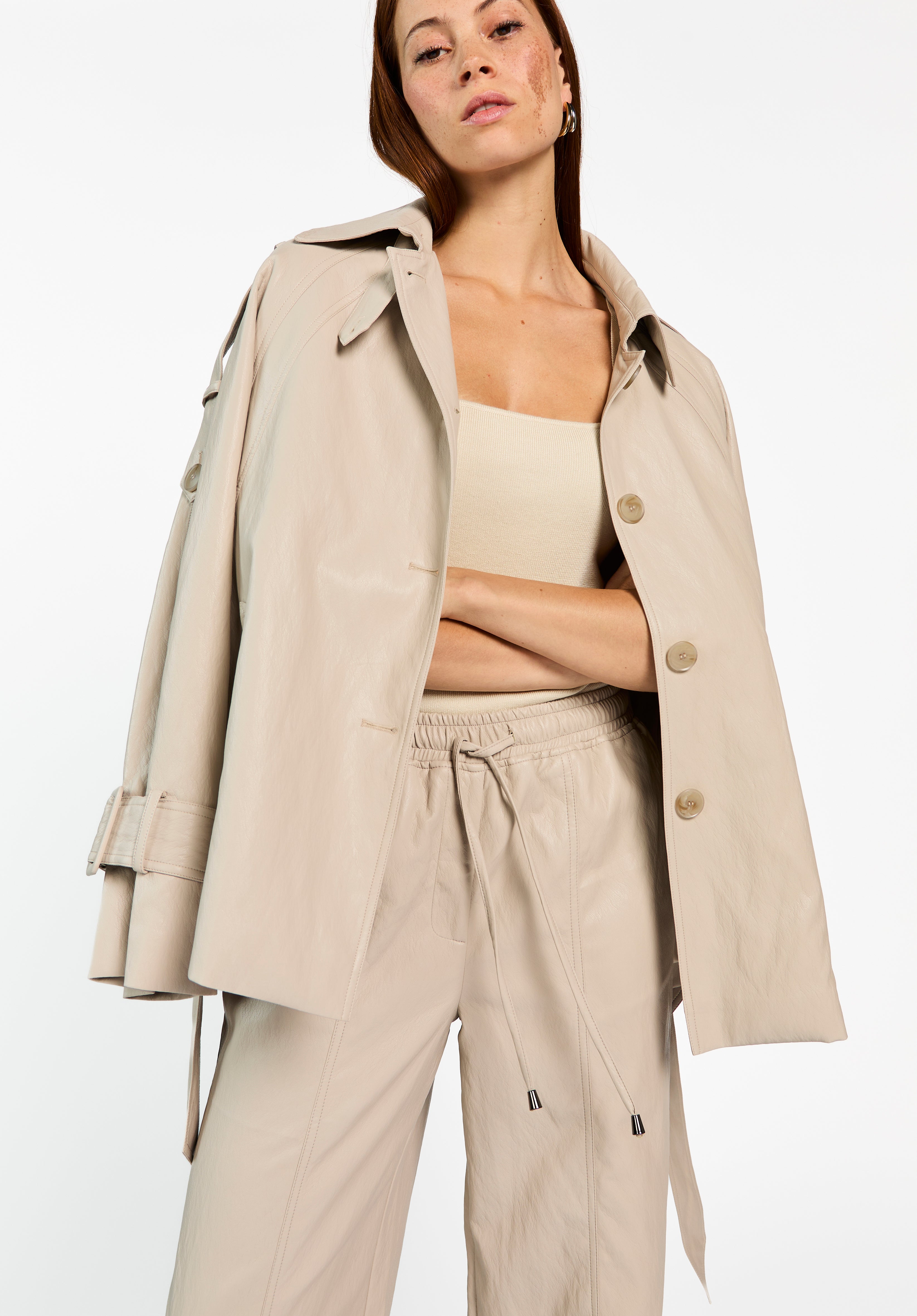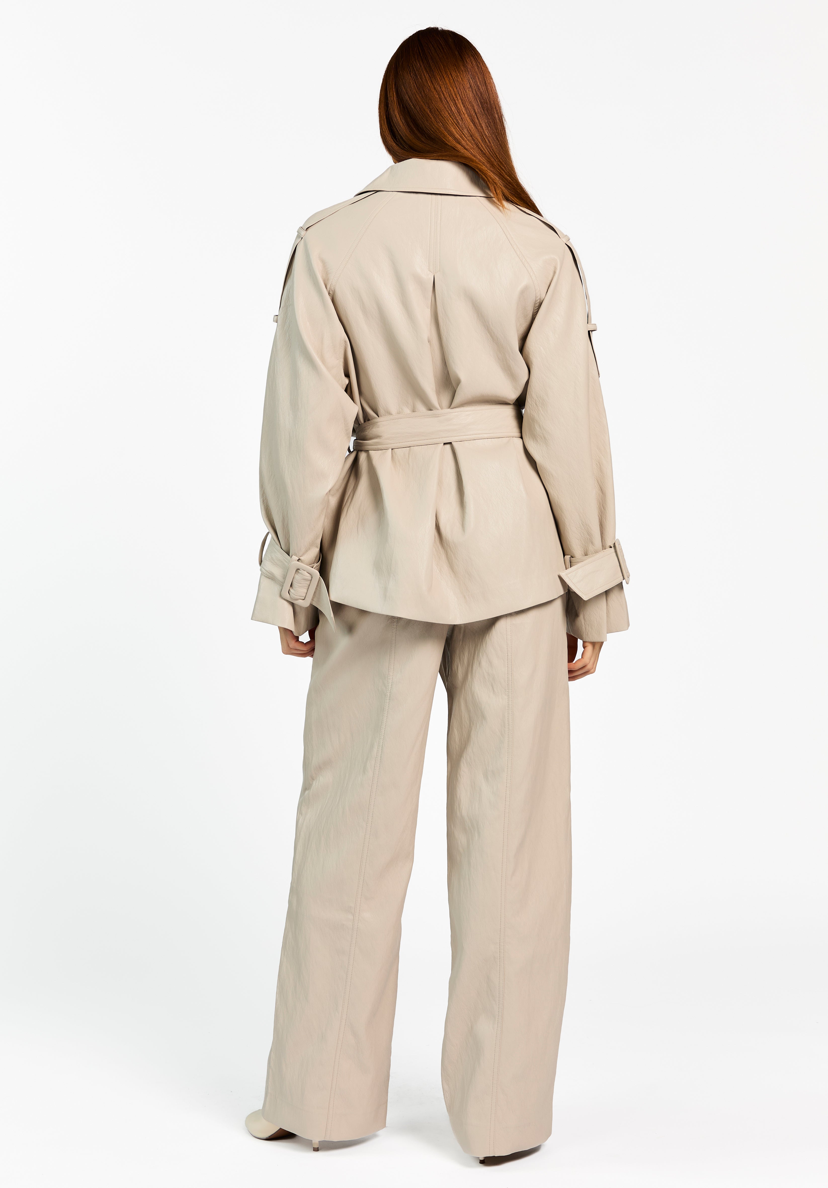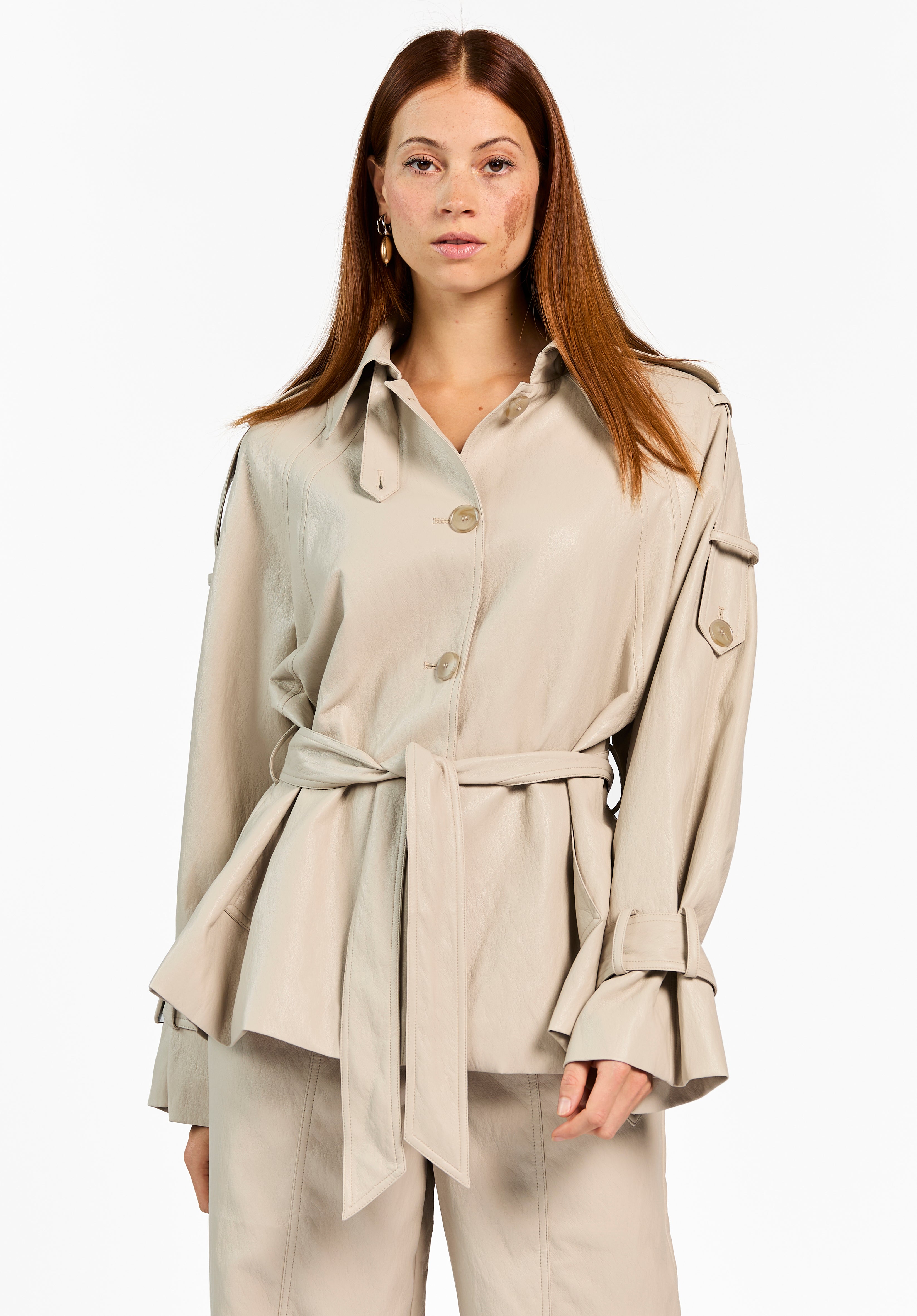 Het Meike Jack is een moderne update van de klassieke trench. Dit jack heeft een licht glanzende finish en een soepele structuur die mooi valt. De riem in de taille zorgt voor een vrouwelijk silhouet, terwijl de details op de mouwen en schouders het ontwerp extra karakter geven. Combineer met de Esila broek voor een mooie co-ord set.